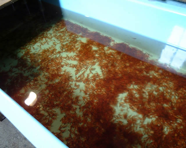 The alevin have a small yolk sac which feeds them for several weeks. After this time they are released by us at various points in the river, usually in small burns where (1) the chances of survival are higher (2) we encourage fish to return to spawn and (3) the alevin can find "sheltered accomodation" easier.