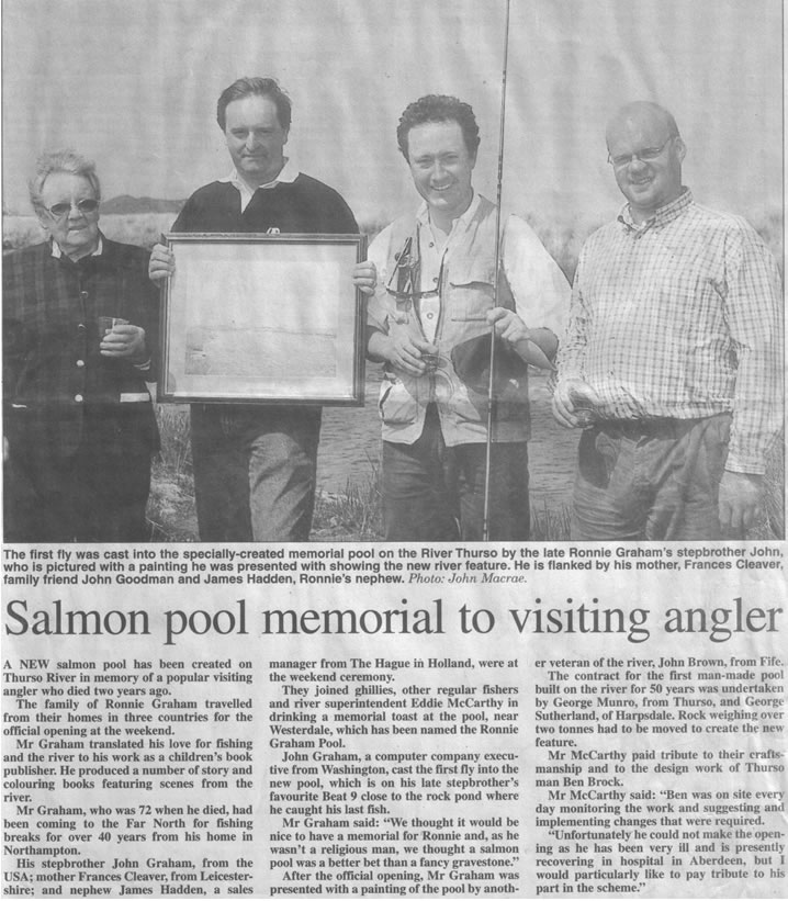 "A new salmon pool has been created on the Thurso River, in memory of a popular visiting angler who died two years ago. The family of Ronnie Graham travelled from their homes in three countries to officially open the new haunt. Mr Graham translated his love for fishing and the river to his work as a children's book publisher. He produced a number of story and colouring books featuring scenes from the river. Mr Graham, who was 72 when he died had been visiting the far north for fishing breaks for more than 40 years from his home in Northampton. His step-brother John Graham, from the US, mother Francis Cleaver, from Leicestershire, and nephew James Haddon, from Holland, were at the weekend ceremony. They joined the ghillies, other regular fishers and river superintendent Eddie McCarthy in drinking a toast to the pool, near Westerdale, named in Ronnie's honour. John Graham, computer company executive from Washington, cast the first fly into the pool, which is on his late step-brother's favourite beat 9 and near where he caught his last fish. Mr. Graham said: "We thought it would be nice to have a memorial for Ronnie and, as he wasn't a religious man, we thought a salmon pool was a better bet than a fancy grave-stone." First manmade pool built on the River for 50 years was built by George Munro from Thurso, and George Sutherland, from Harpsdale. Mr. McCarthy yesterday paid tribute to their craftsmanship and to the design work of Thurso man Ben Brock. Mr. McCarthy said: "Unfortunately Ben could not make the opening as he is very ill in hospital, but I would like to pay tribute to his part in the scheme. It was a very challenging job and which rock weighing over two tonnes had to be moved."